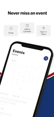 NEVER MISS AN EVENT The event section shows a list of events throughout the district. Users can add an event to their calendar and share the event with friends and family with one tap.